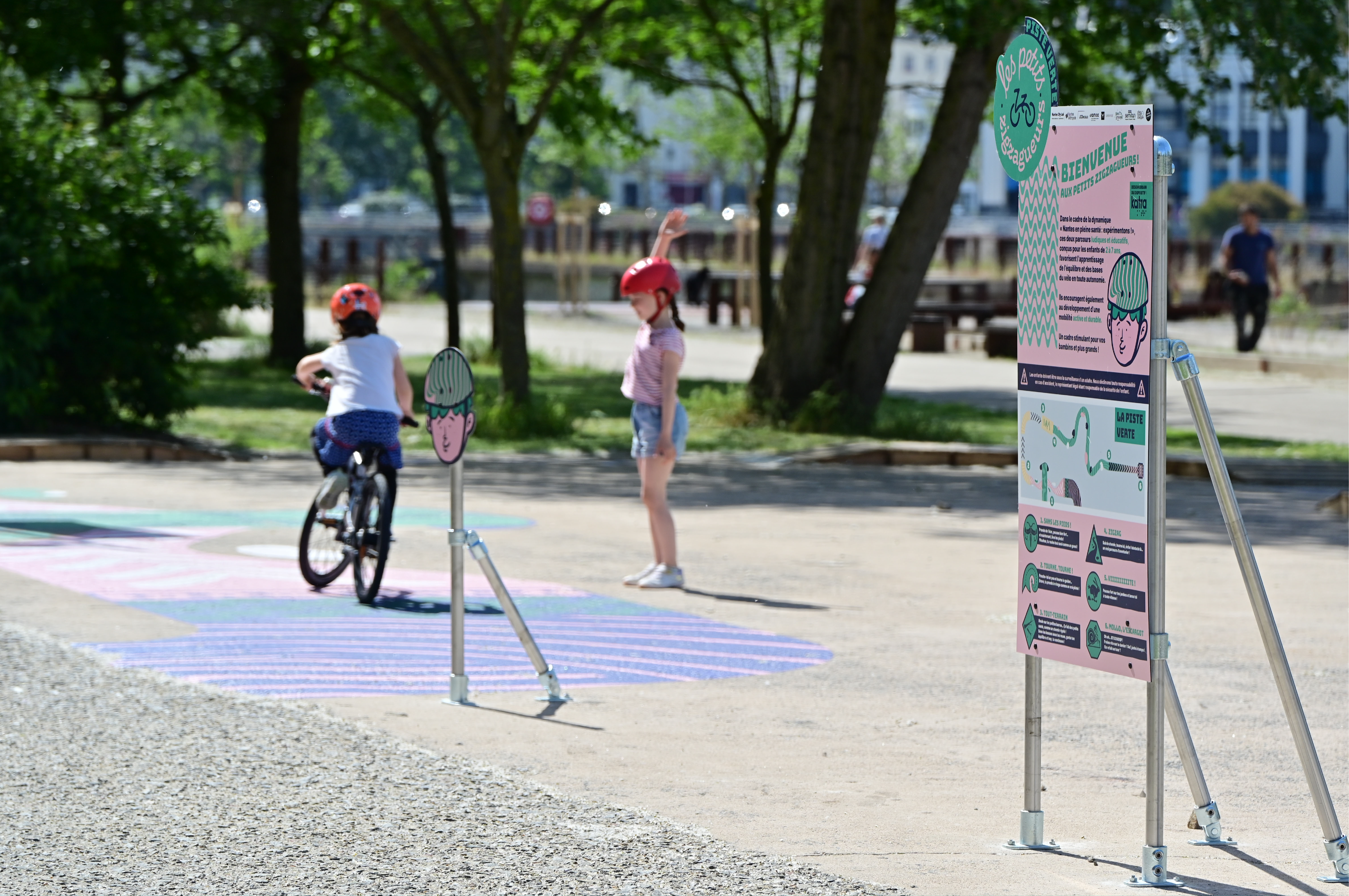 Ce parcours, appelé "les petits zigzagueurs", est situé au cœur du Parc des Chantiers à Nantes et utilise des solutions légères, mixtes, low-tech et réversibles, en privilégiant le réemploi de matériaux.