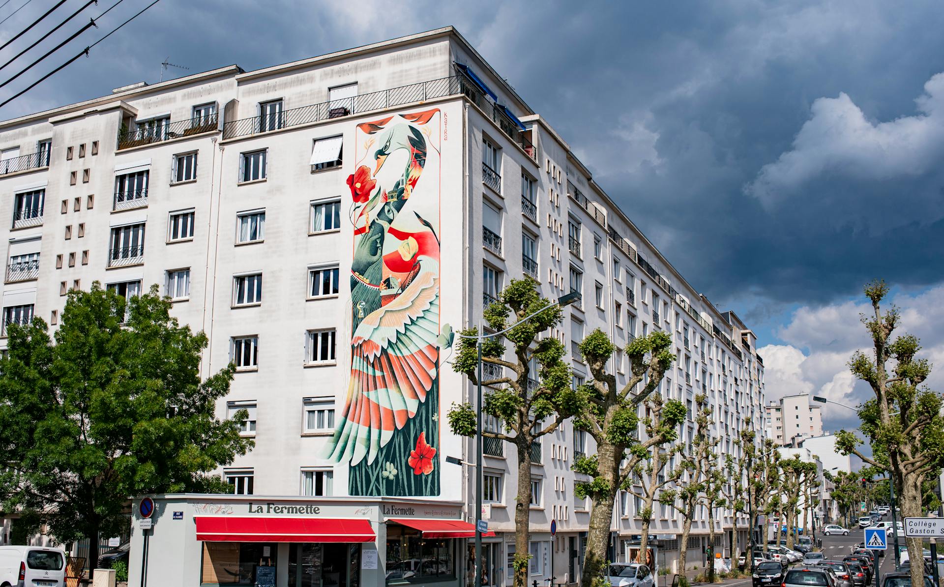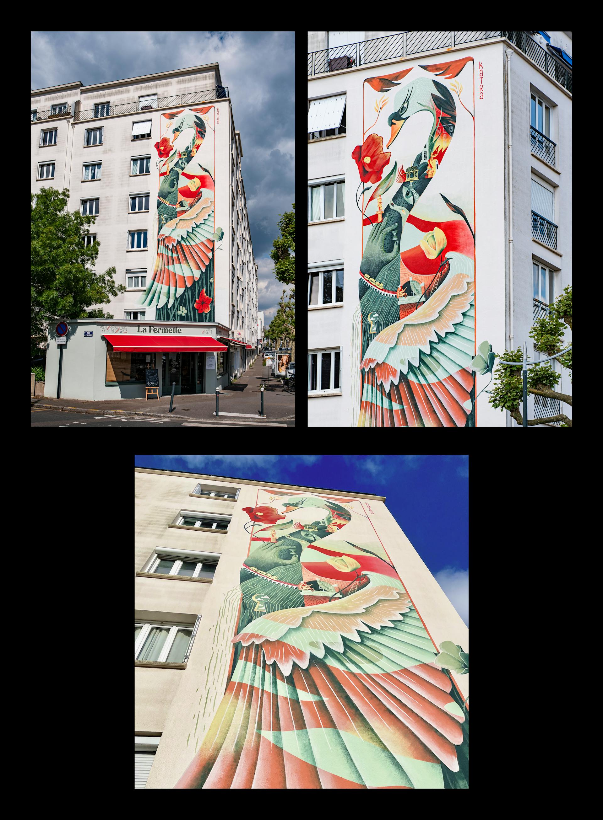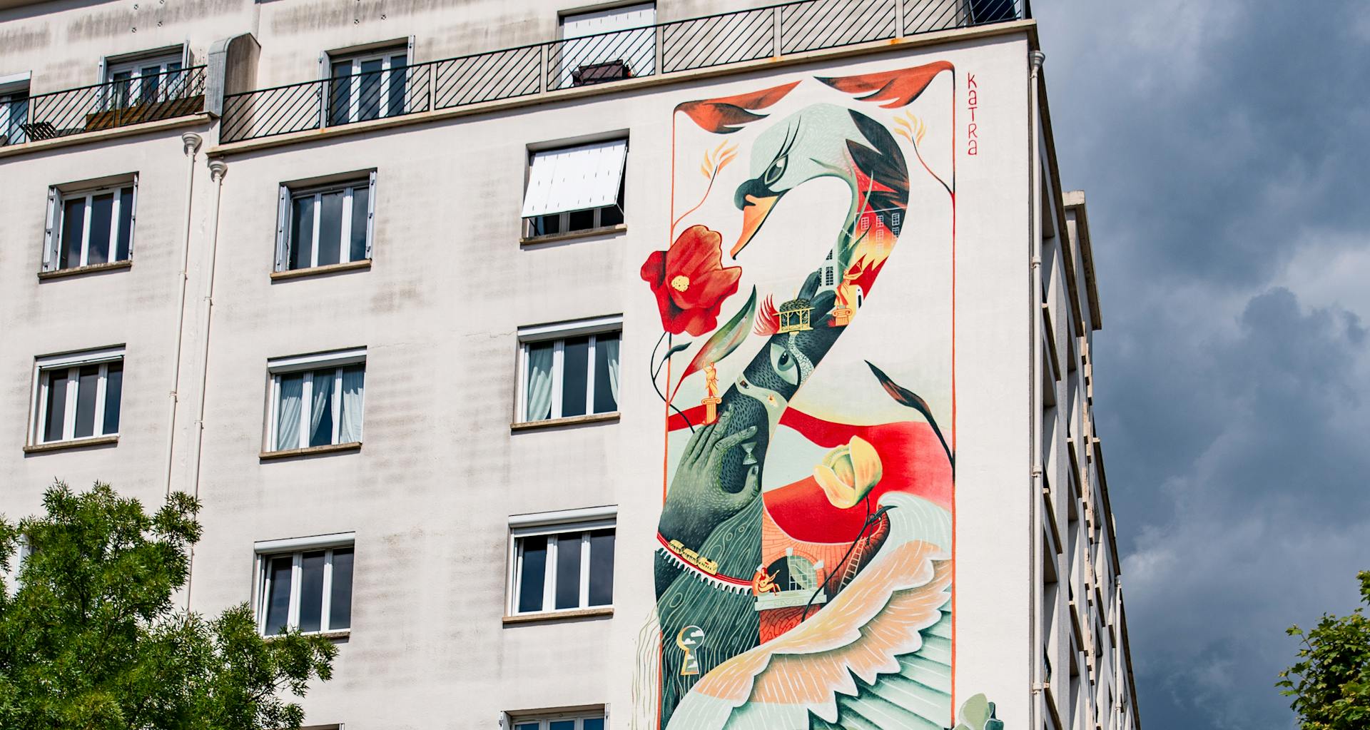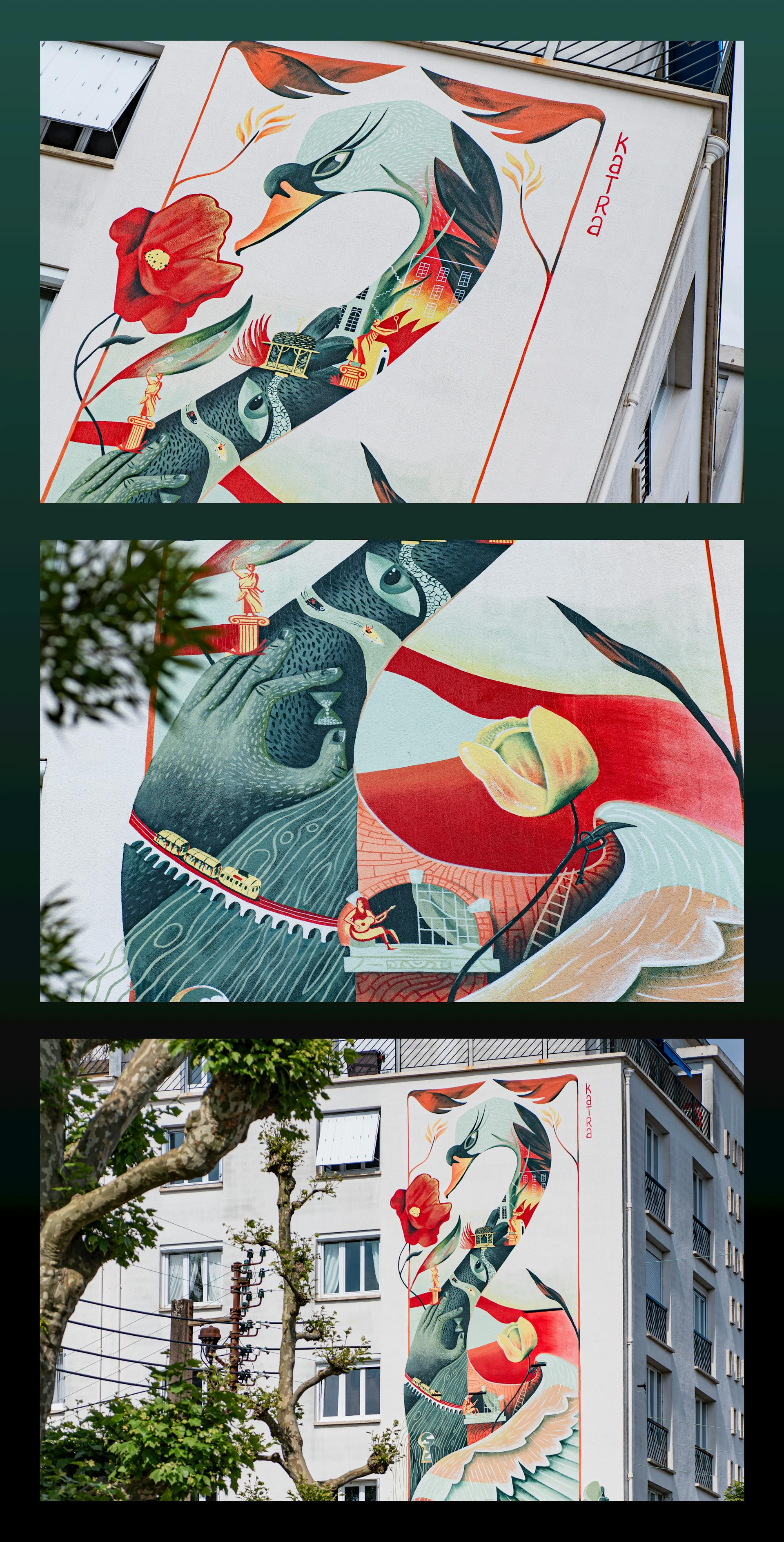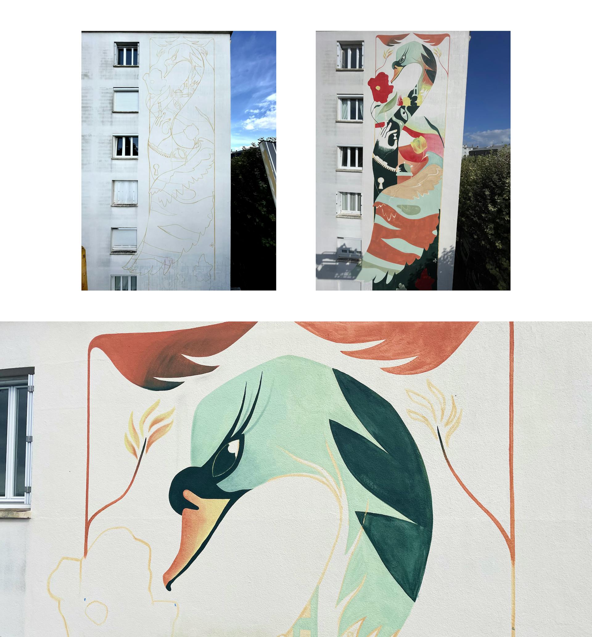 Le mur de la résidence Les Fleurs d’Armor, visible de loin, invite à contempler un élément central en première lecture puis des scènes détaillées en se rapprochant. Les habitants et les designers ont sélectionné un animal totem qui fait le lien entre la Chézine et le Parc de Procé, entre l’eau et la terre, entre les enfants et les adultes, à l’instar d’un passeur d’histoire pour le quartier. Majestueux et élégant, le cygne offre une silhouette dynamique et emblématique dialoguant avec la cime des platanes. Il propose un regard bienveillant sur les espaces environnants et emmène dans son sillon le monde du vivant.