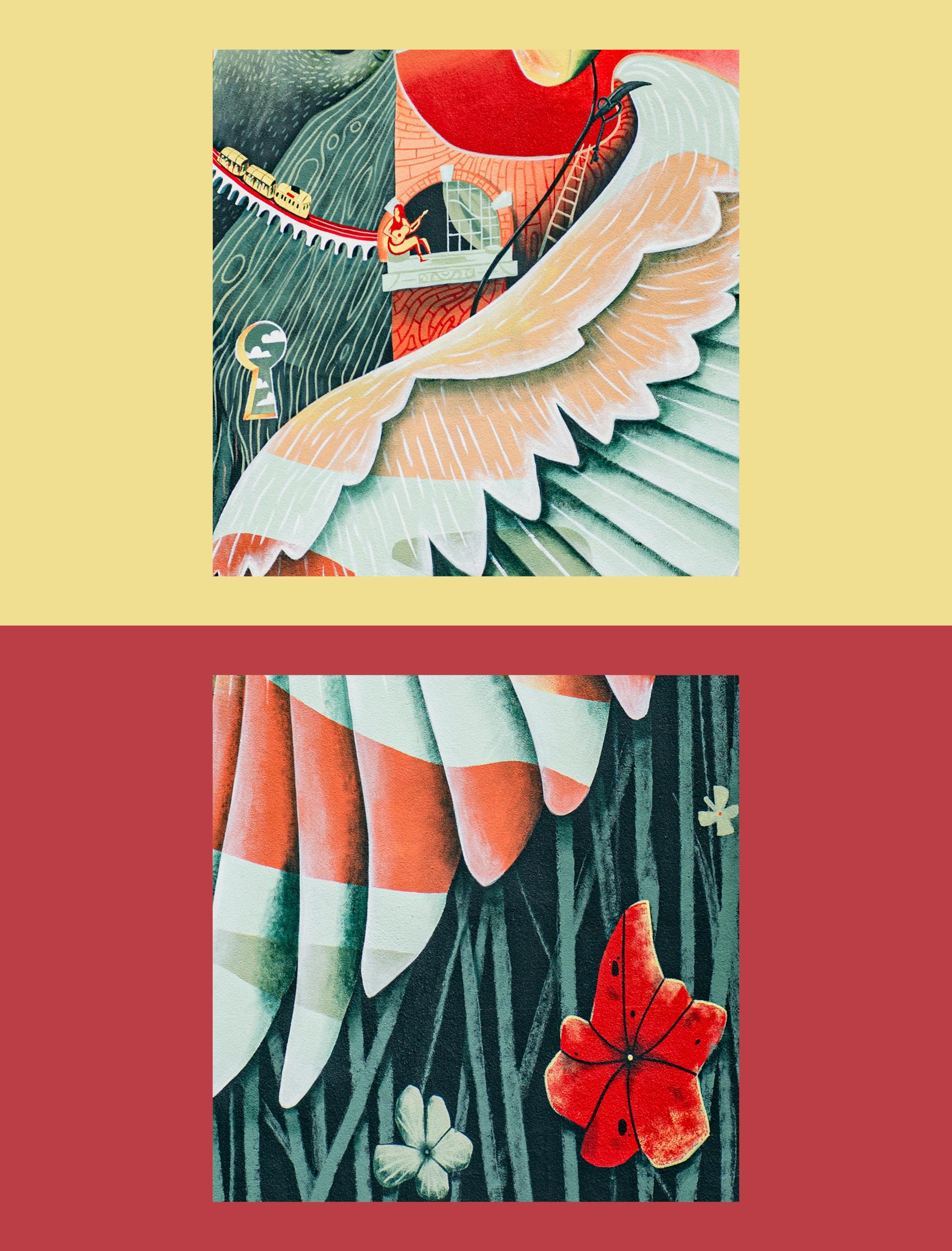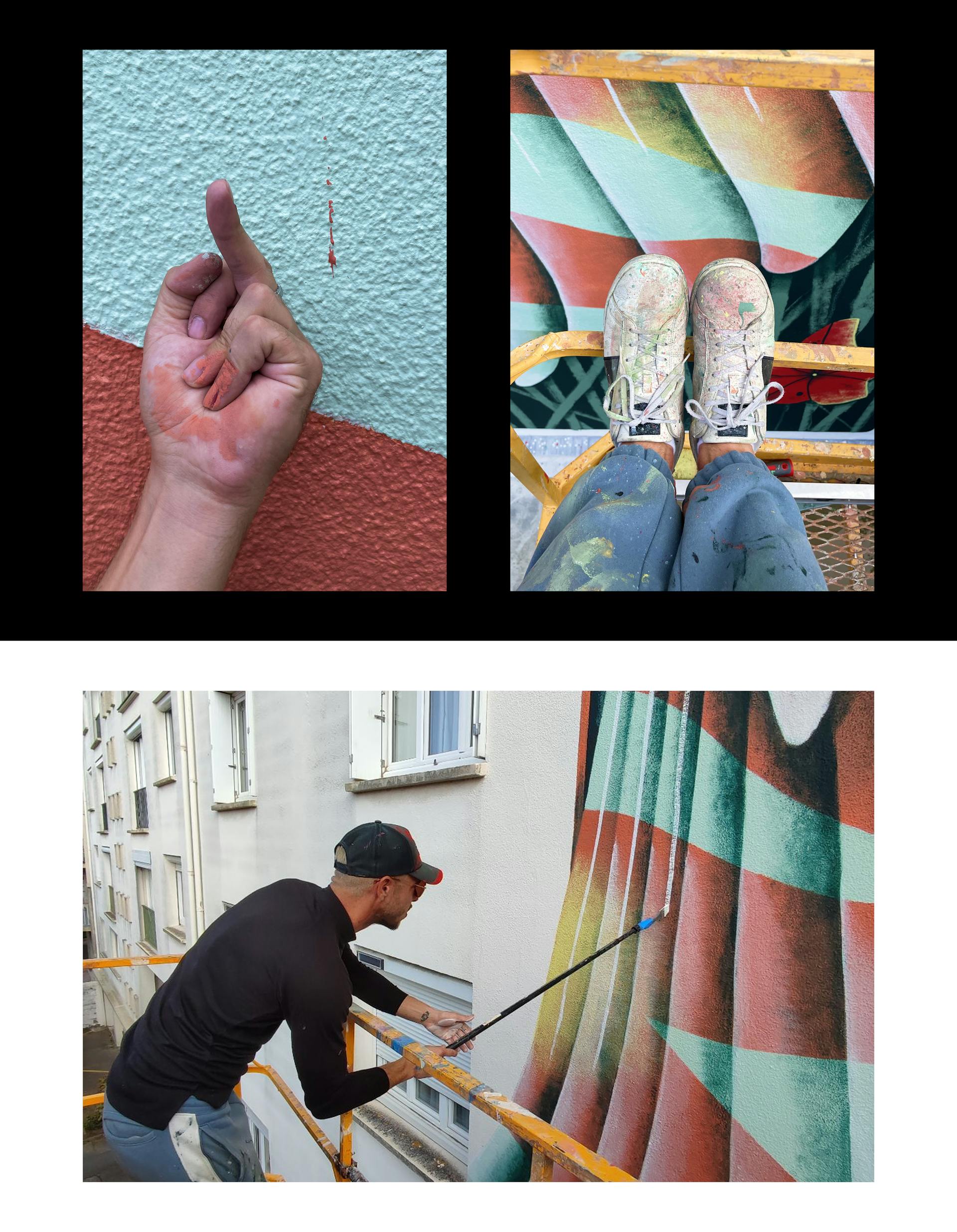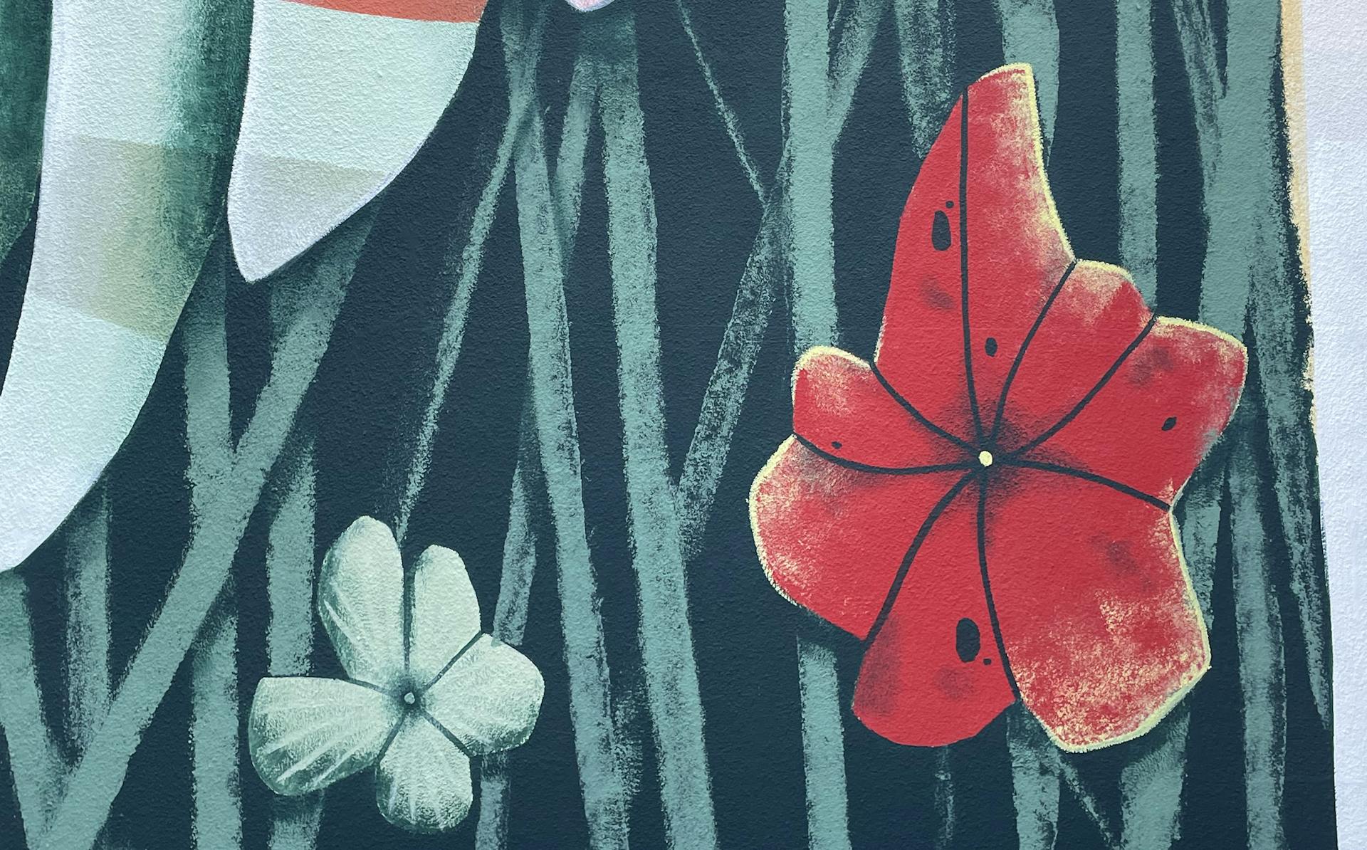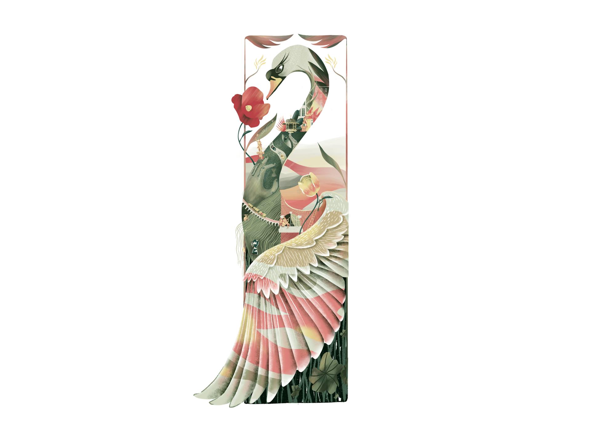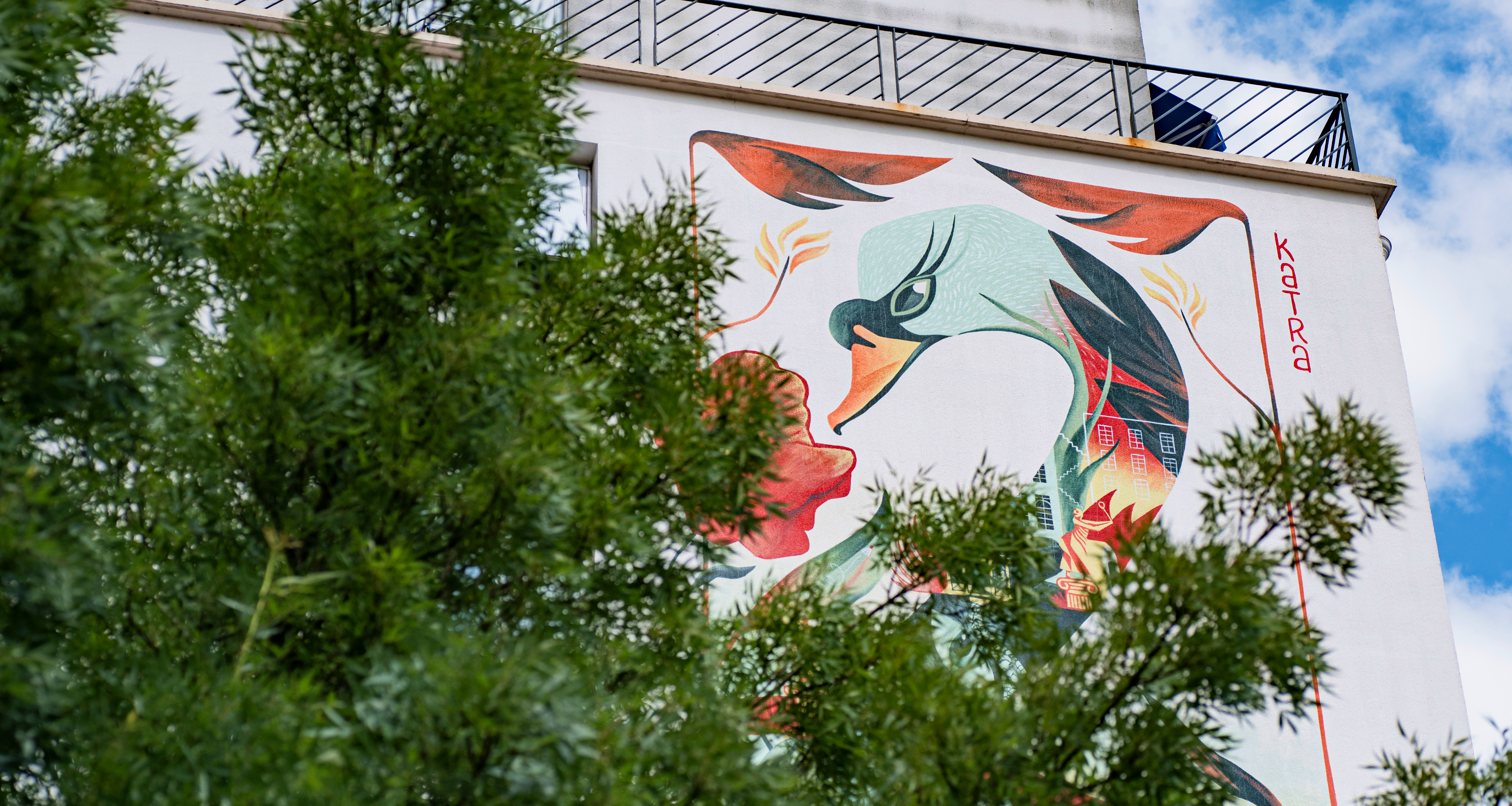 Le mur de la résidence Les Fleurs d’Armor, visible de loin, invite à contempler un élément central en première lecture puis des scènes détaillées en se rapprochant. Les habitants et les designers ont sélectionné un animal totem qui fait le lien entre la Chézine et le Parc de Procé, entre l’eau et la terre, entre les enfants et les adultes, à l’instar d’un passeur d’histoire pour le quartier. Majestueux et élégant, le cygne offre une silhouette dynamique et emblématique dialoguant avec la cime des platanes. Il propose un regard bienveillant sur les espaces environnants et emmène dans son sillon le monde du vivant.
