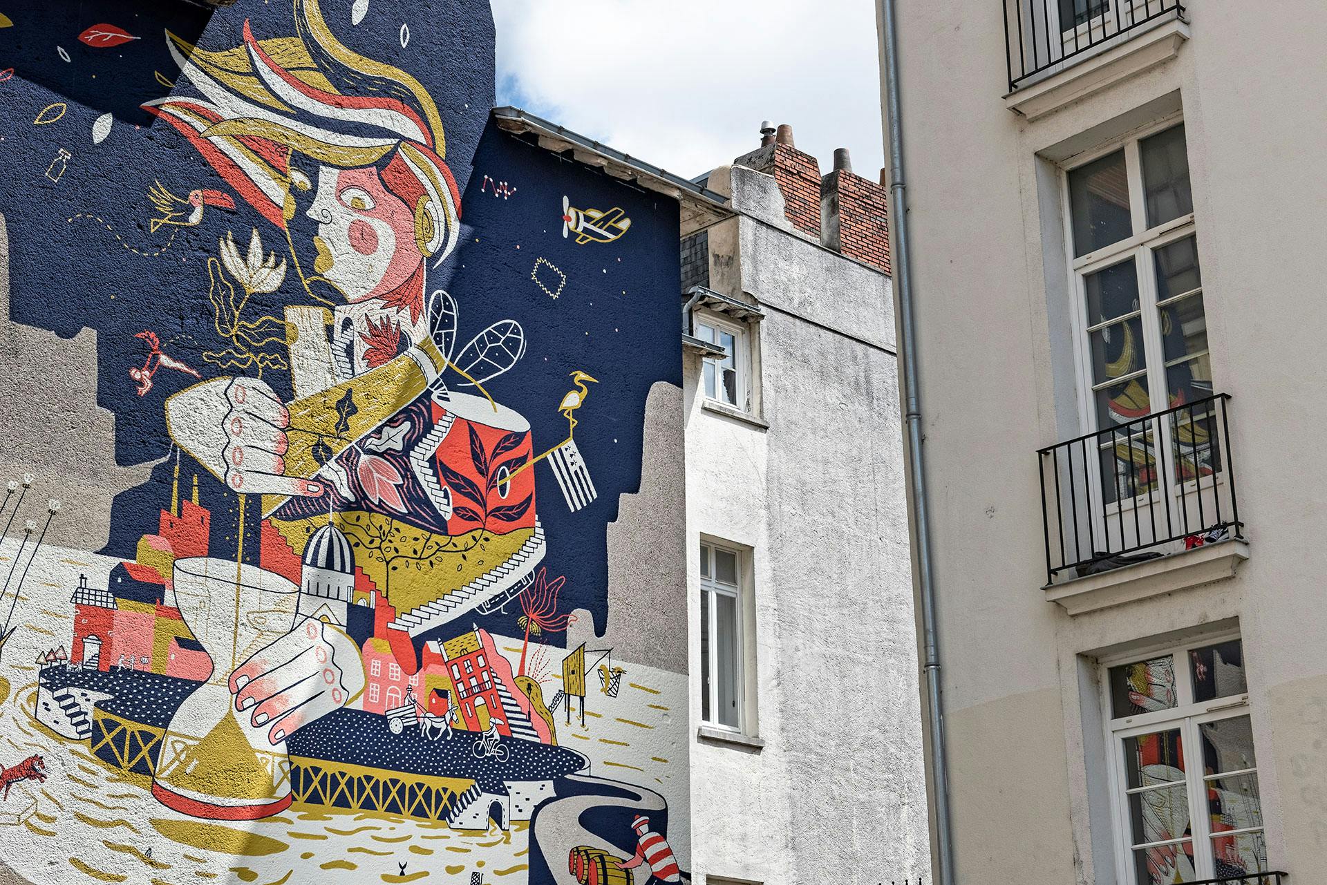 L'histoire de Nantes présente des anachronismes où les références se mélangent ; bombardiers alliés et dirigeable de Jules Vernes, Willy Wolf plongeant dans le vide, toucans, cannes à sucres, anneaux triangulaires, bananiers, hérons cendrés et silure dans un carrelet... Les abeilles draguent les bateaux jusqu'aux Quais de la fosse, crevasse de Loire qui permettait d'amarrer les premiers rafiots et dont le nom Fosse restera.